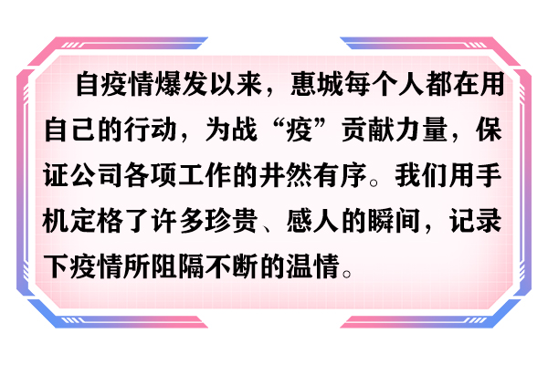“您好,请等一下,我们先帮您测一下体温。”这是自疫情发生后,惠城厂区及研发大楼门卫、前台对每个进入公司的人员所必需进行的环节。体温测量,能够有效把好源头关,隔断传染源,保障员工安全生产、办公。