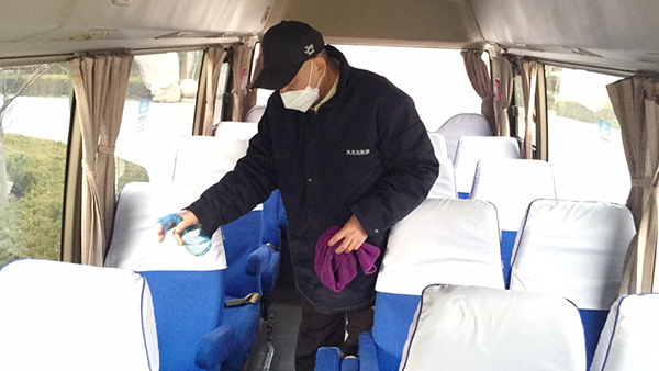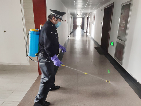 公司为在岗员工发放了口罩、喷壶、消毒酒精等防护用品,每日对各工作场所、班车、车库、电梯、宿舍等进行定点消毒。