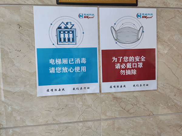 电梯里贴上了暖心的抽纸,门把手也勤消毒做到重点防范。