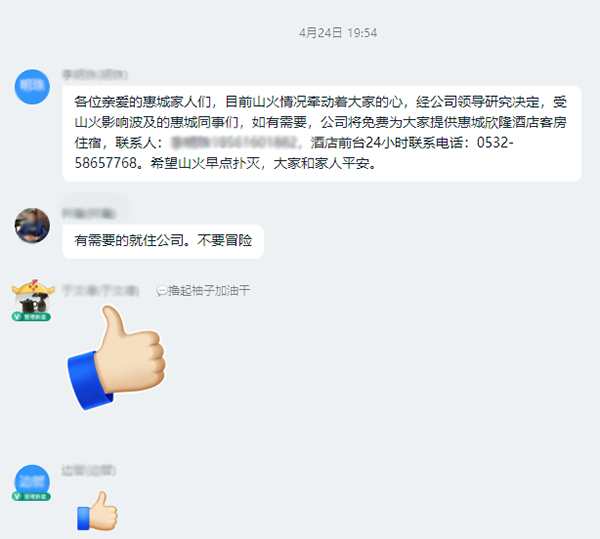近日,青岛西海岸新区小珠山发生一起森林火灾,因期间高山阵风风力陡增、山高地险,给火灾扑救造成困难。4月24日晚,山火已蔓延至海尔大道附近,公司有不少员工居住在这一区域,山火的继续蔓延严重威胁到他们的安全。