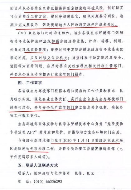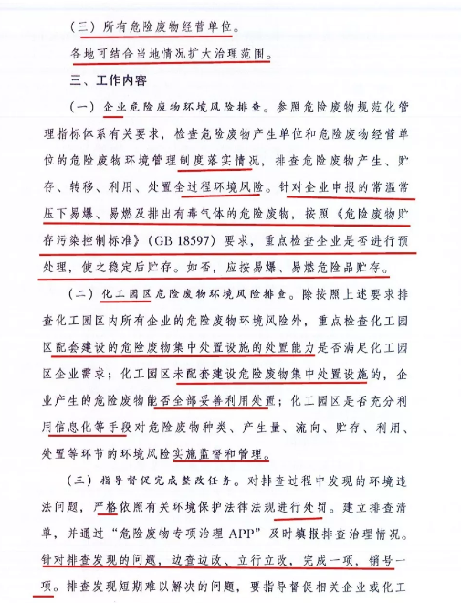 《通知》要求今年年底前,在全国范围内排查化工园区、重点行业危险废物产生单位、所有危险废物经营单位的危险废物环境风险,消除环境风险隐患。