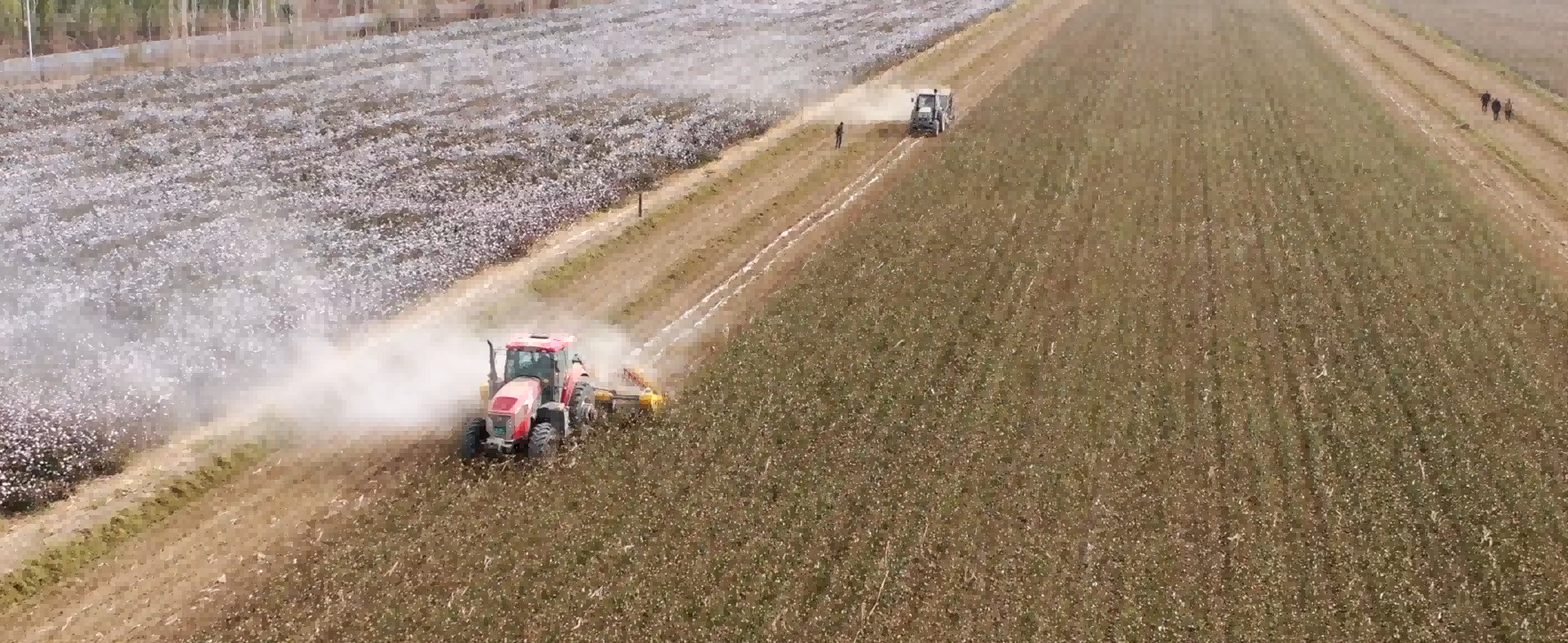 近日,巴州惠疆在尉犁县及哈密地区的农田残膜回收工作正在紧锣密鼓、如火如荼的进行中,打杆机将棉田中的棉杆打断粉碎处理,打杆机后方的搂膜装置将铺在棉田地上的残膜进行聚拢,残膜回收机在田地里来回穿梭,残膜被机器的卷筒快速卷起,集中回收到后置的聚膜框中,机械所过之处,棉田干净平整,残膜回收率能够达到90%以上。