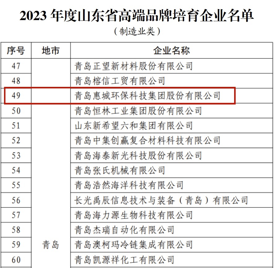 日前,山东省市场监督管理局公布了“2023年度山东省高端品牌培育企业”名单,青岛惠城环保科技集团股份有限公司榜上有名。