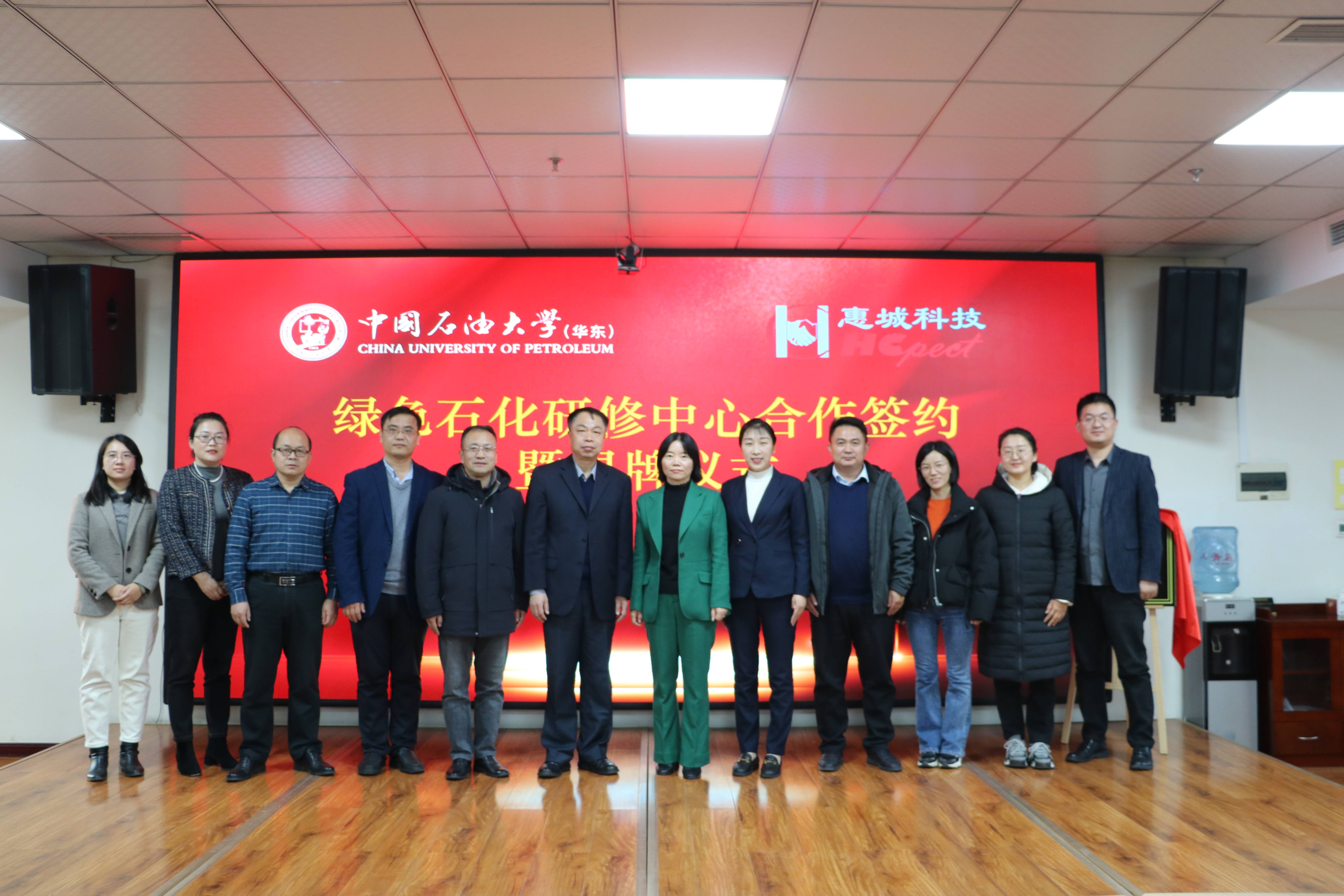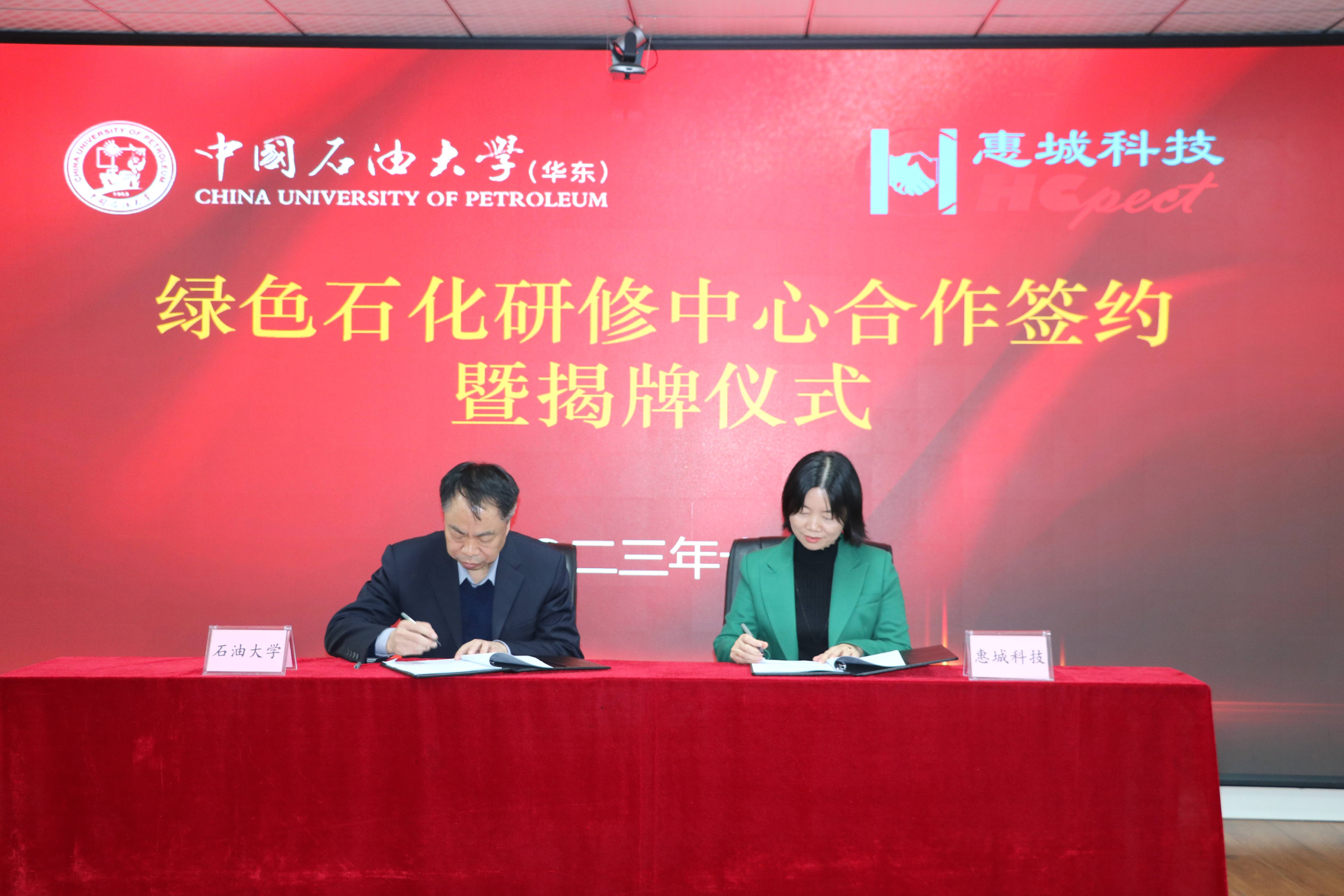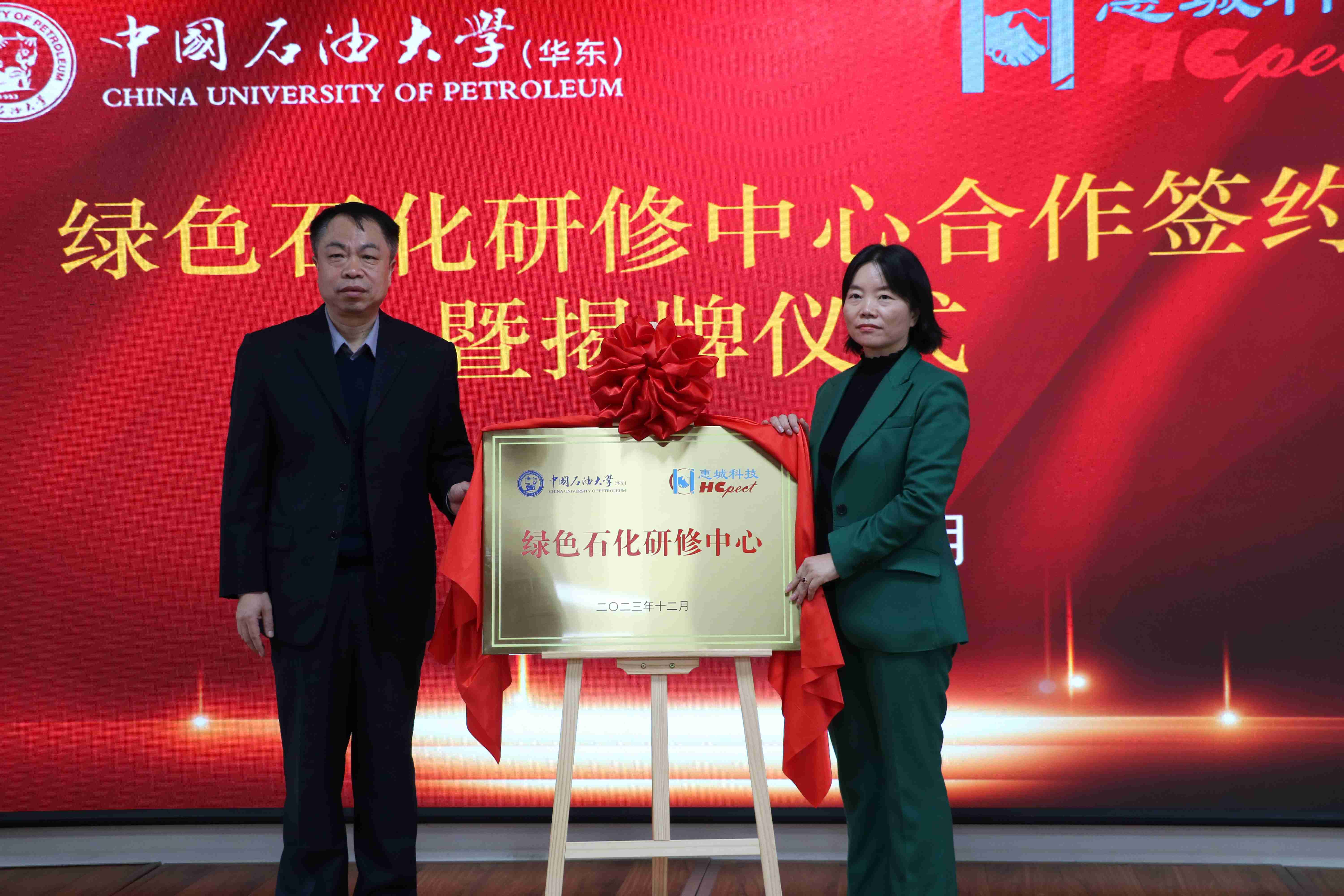 签约仪式 揭牌仪式 中国石油大学(华东)教育发展中心主任韩红江致辞 韩江红主任在致辞中表示,服务石化行业是中国石油大学(华东)继续教育的立足之本,也是特色优势所在。通过绿色石化研修中心的建立,校企双方将以此为契机,围绕危废处置、资源化产品、烟气治理等方面开展培训课程开发、现场教学实践等合作,将绿色发展理念融入课程体系,共同助力绿色环保技术的推广运用,推动经济社会发展与生态环境保护协调发展。 惠城环保董事长叶红致辞 叶红董事长在致辞中表示,绿色石化研修中心的落地揭牌将是惠城环保与中国石油大学(华东)在又一新领域的优势合作;是在国家大力倡导环境保护、双碳达标政策背景下,充分整合惠城环保在石化环保领域的技术创新成果和中国石油大学(华东)优秀的继续教育力量,共同助力石化行业绿色转型发展的战略性举措;是惠城环保与中国石油大学(华东)在助推国家环保事业方面共同承担的社会责任。双方将全力推进该合作项目的落地实施,为国家绿水青山贡献校企力量。 合影留念 本次合作是惠城环保与中国石油大学(华东)在校企深入合作基础上的又一个重要里程碑,标志着双方在推动石化行业绿色发展和人才培养方面迈出了更加坚实的一步。绿色石化研修中心将成为双方共同成长的摇篮,为我国绿色石化事业的发展做出积极的贡献。